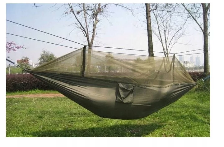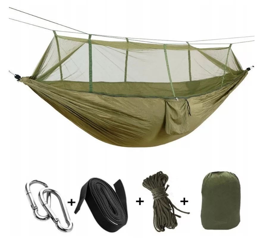 Houpací síť s moskytiérou v zelené barvě v praktickém držáku 260 cm x 140 cm s příslušenstvím