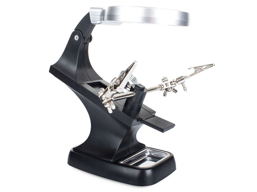 Má silné aligátoří svorky, které pevně drží obrobek na místě. Díky lupě a 10 LED diodám bude skvělým pomocníkem při pečlivých úkolech.