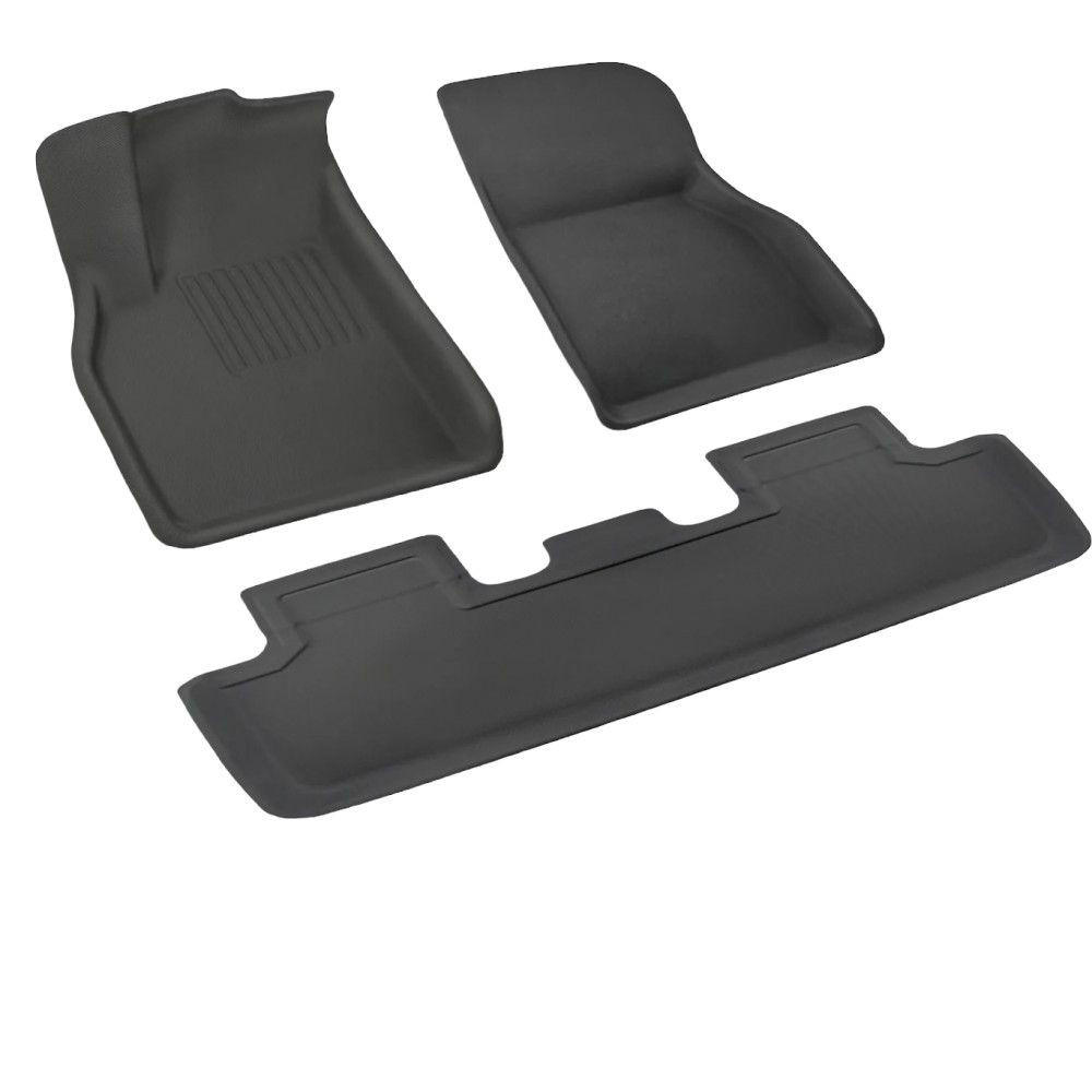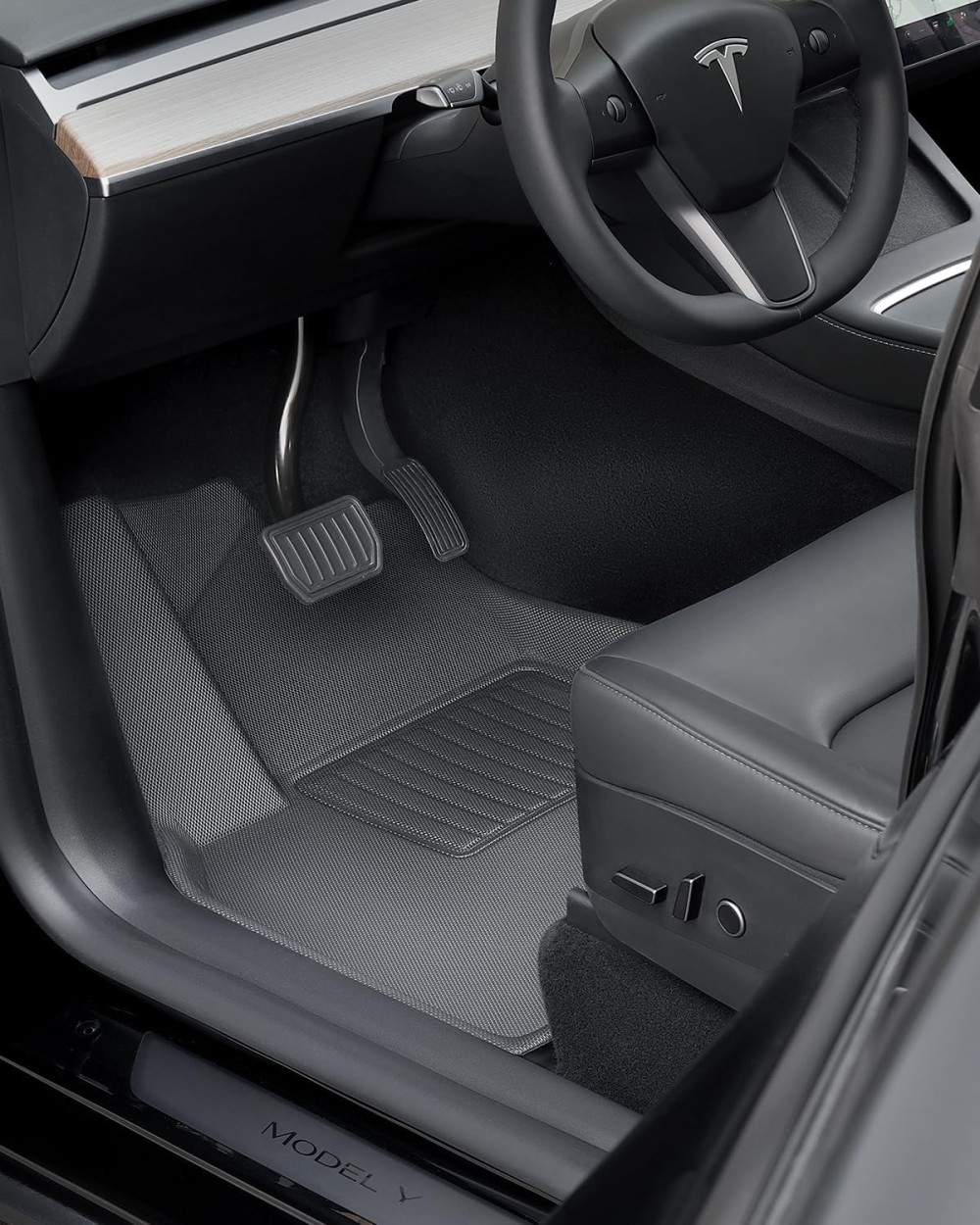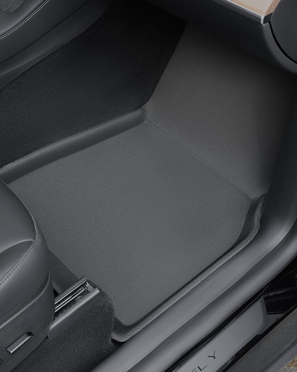 Gumová rohož Tesla Model Y (s polyesterovou tkaninou a výztuží). Vysoký boční okraj a výztuž zabraňují sklouznutí rohoží. Povrch polyesterové tkaniny zachycuje písek, bláto, sníh a nečistoty.