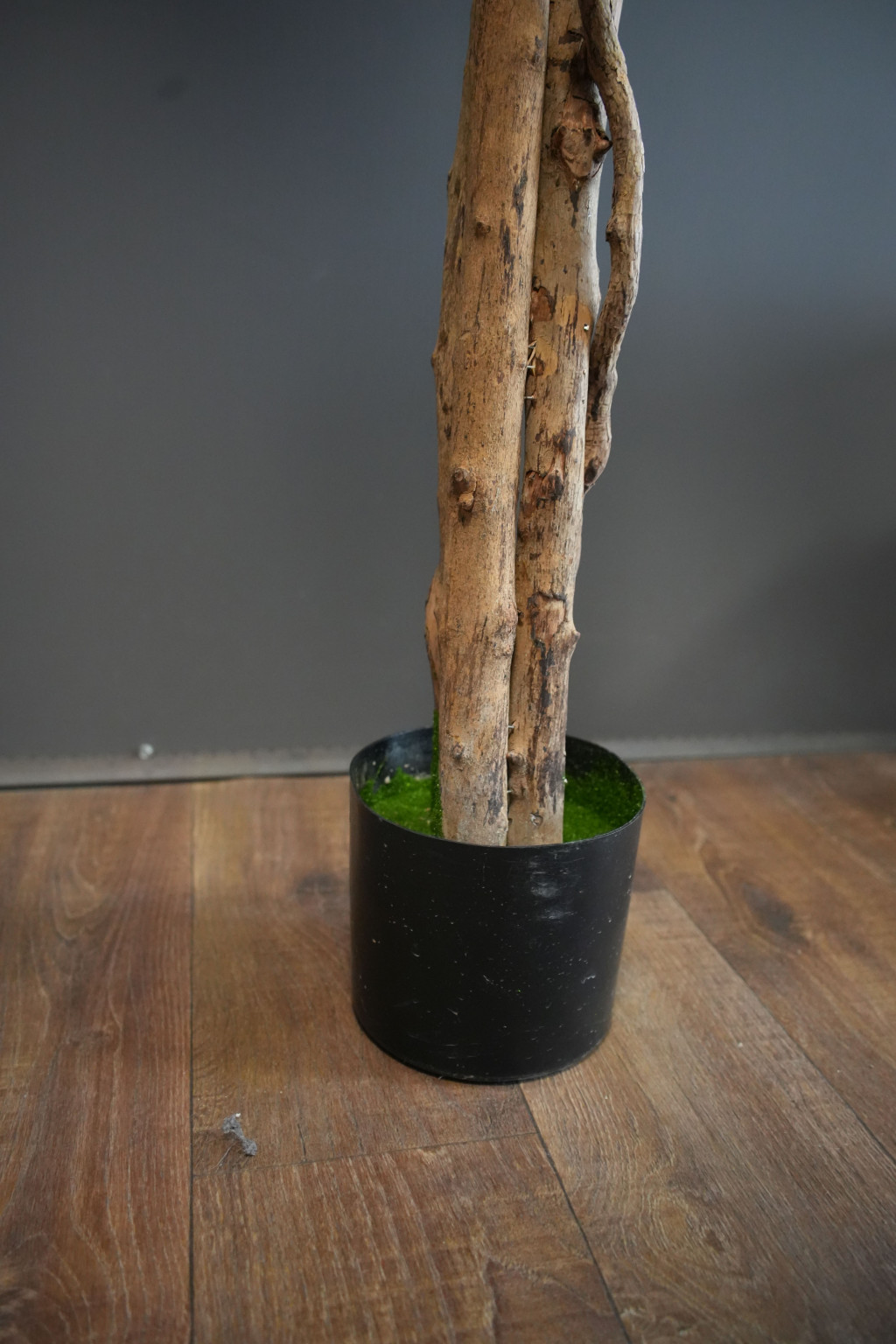 Realistický umělý strom je pevně upevněn v plastovém květináči.