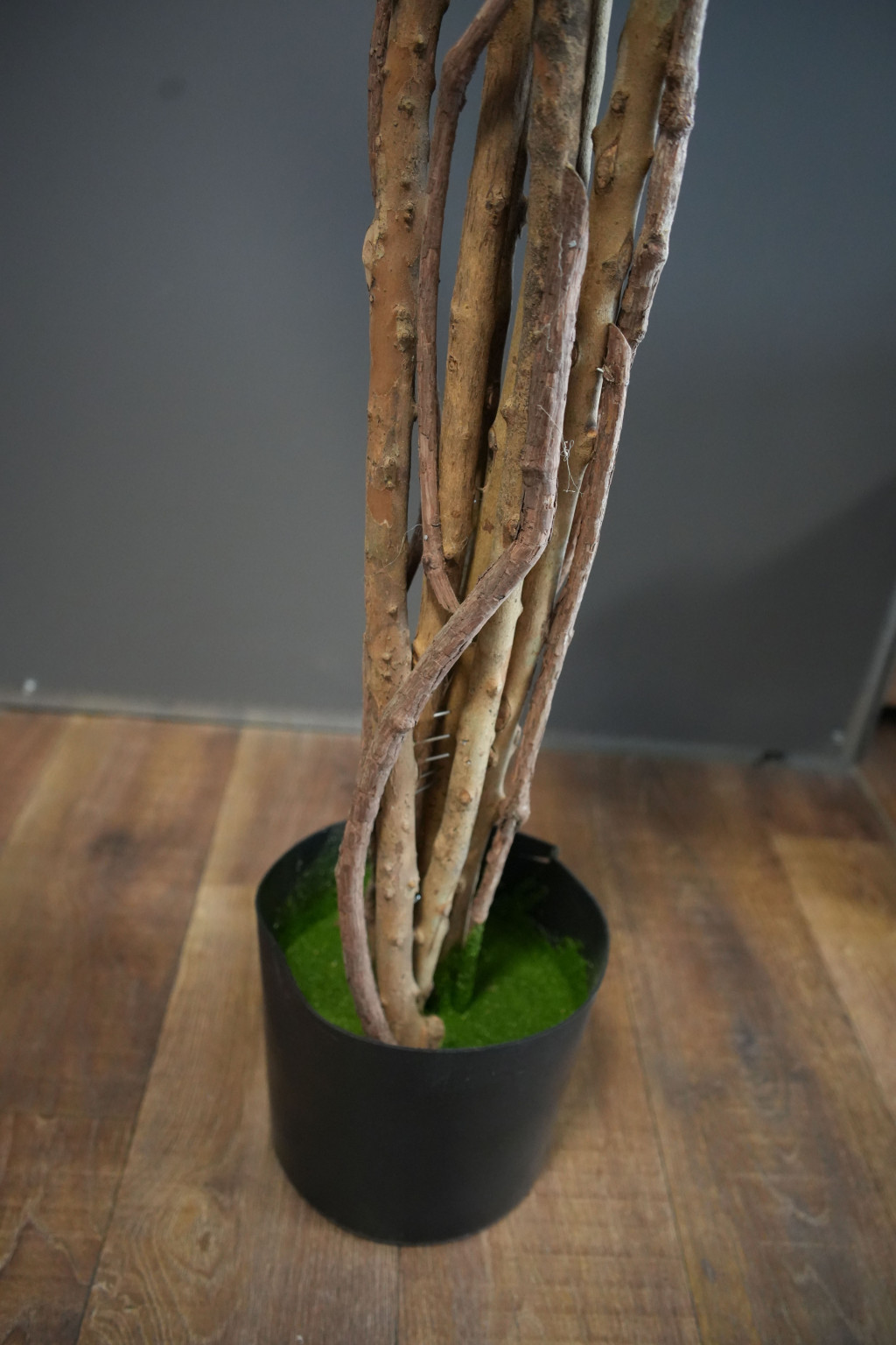 Realistický umělý strom je pevně upevněn v plastovém květináči.