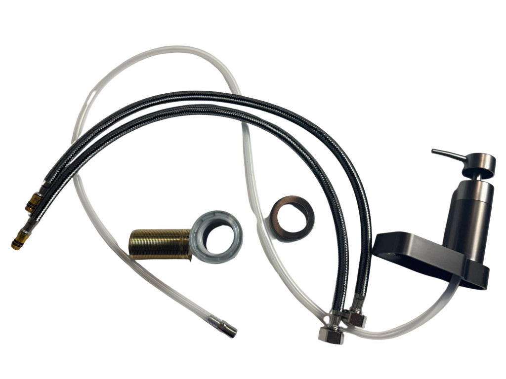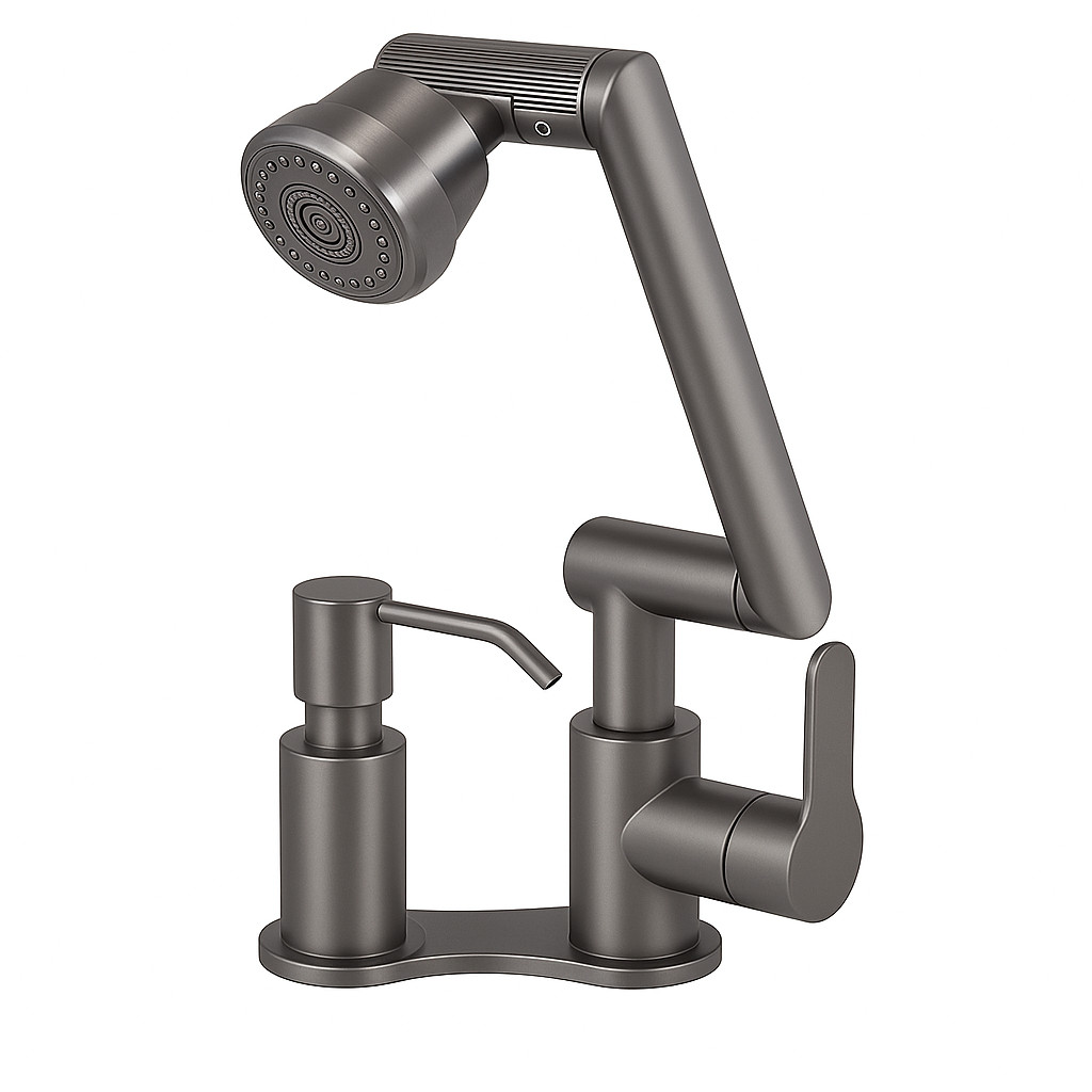 Tato stylová, moderní sada kuchyňské baterie a dávkovače mýdla je perfektní volbou pro ty, kdo hledají praktické a zároveň estetické řešení. Baterie je vyrobena z prémiového matného kovu, který jí nejen poskytuje elegantní vzhled, ale také výjimečnou odolnost. Multifunkční sprchová hlavice umístěná v horní části nabízí jednoduché ovládání a efektivní průtok vody, čímž usnadňuje každodenní mytí a čištění.