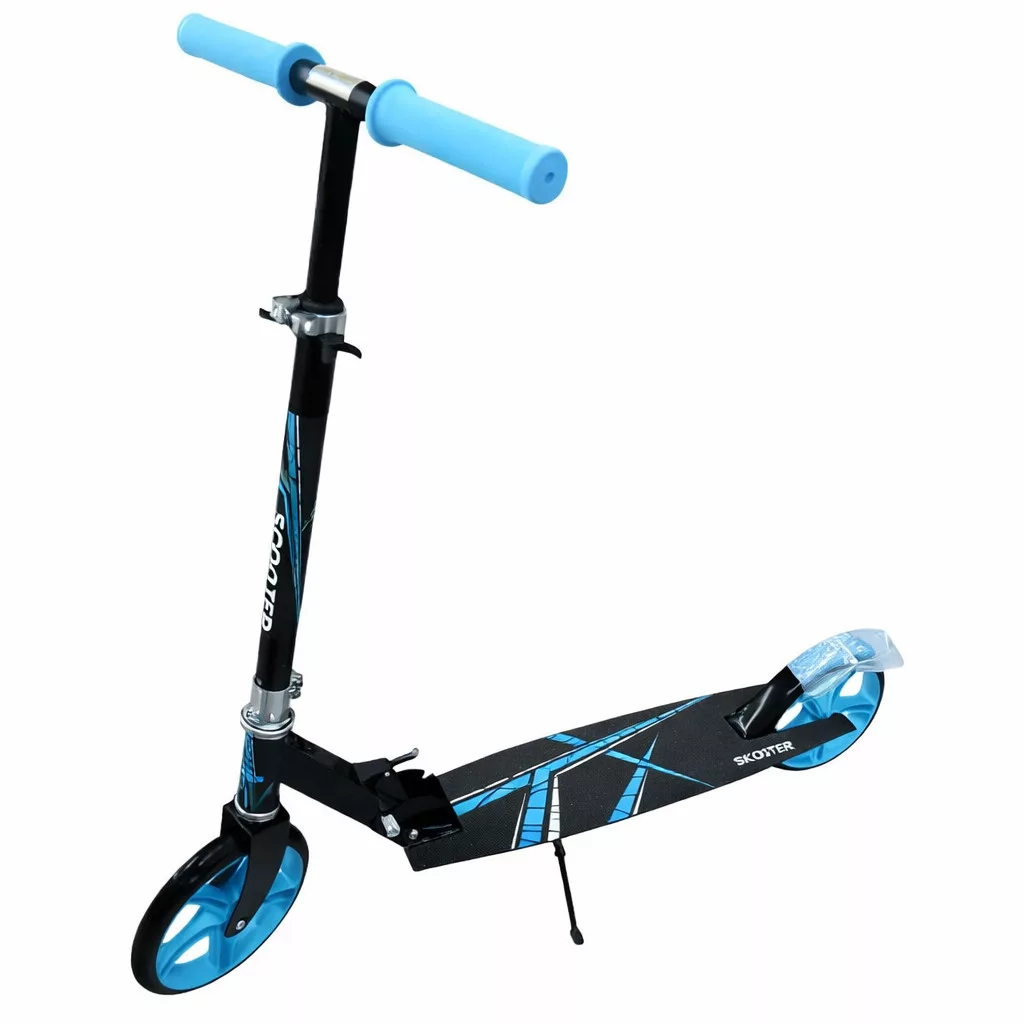 Skládací koloběžka v modro-černé barvě - nastavitelná výška, brzdový systém zadních kol, silikonová kolečka