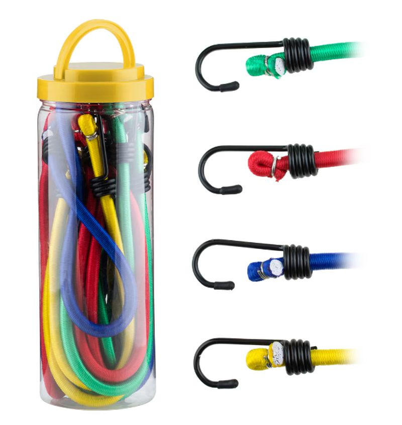 Barevná 18dílná sada pryžových pavouků různých velikostí v praktickém úložném válci, ideální pro rychlé a bezpečné zabezpečení nákladu.